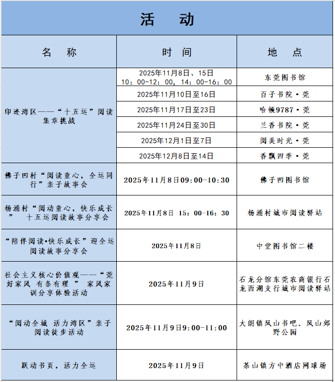 从展厅里的历史回溯到户外的亲子徒步,从趣味集章挑战到校园里的绘本课堂,东莞图书馆以“阅读”为纽带,将十五运的活力与精神传递到城市每个角落。无论你是体育爱好者、阅读达人,还是想带孩子感受文化体育魅力的家长,都欢迎走进东莞图书馆及各分馆活动现场,在书香中触摸运动的温度,在运动中品味阅读的乐趣。让我们以书为媒、以运动为翼,为十五运注入文化活力,为湾区生活增添更多精彩,共同书写东莞“阅读+体育”融合发展的美好篇章!