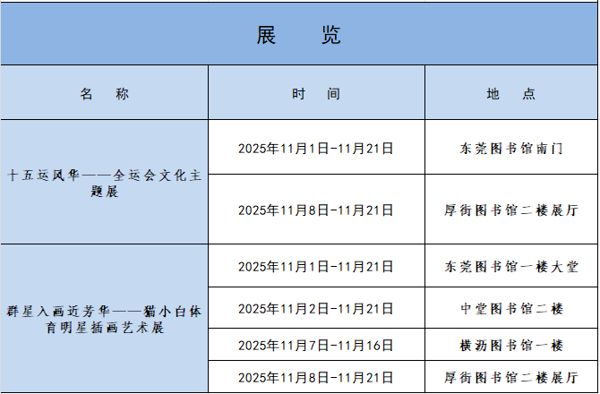此外,读者将在东莞图书馆总馆、厚街分馆、横沥分馆、中堂分馆看到“群星入画竞芳华——猫小白体育明星插画艺术展”,特设“体育明星插画”展示区。一幅幅精美插画生动呈现全运冠军风采,搭配相关项目图片联合展出,既是感受体育明星魅力的好去处,也是绝佳拍照打卡点,让市民在与冠军“同框”中定格精彩瞬间。